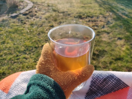 Visst jag är arg, ledsen och trött, men lyckas faktiskt ibland ändå att njuta lite av dagen. I går var det fint väder och jag satt ute ett par gånger och drack min kopp te i solen, ordentligt påpälsad, men jag kunde njuta av det.